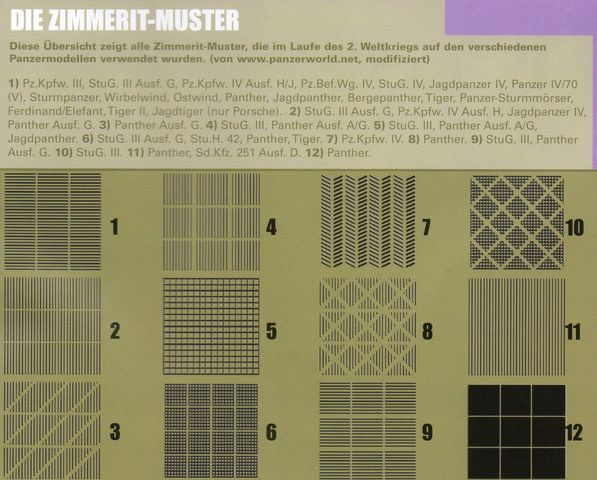 La Zimmerit est appliquée sur certains chars et sur certains canons automoteurs sous casemate produits entre décembre 1943 et le 9 septembre 1944. Elle est rarement appliquée sur des véhicules blindés à ciel ouvert. […] L’application en usine de la Zimmerit a été interrompue le 9 septembre 1944 et sur le terrain le 7 octobre 1944.